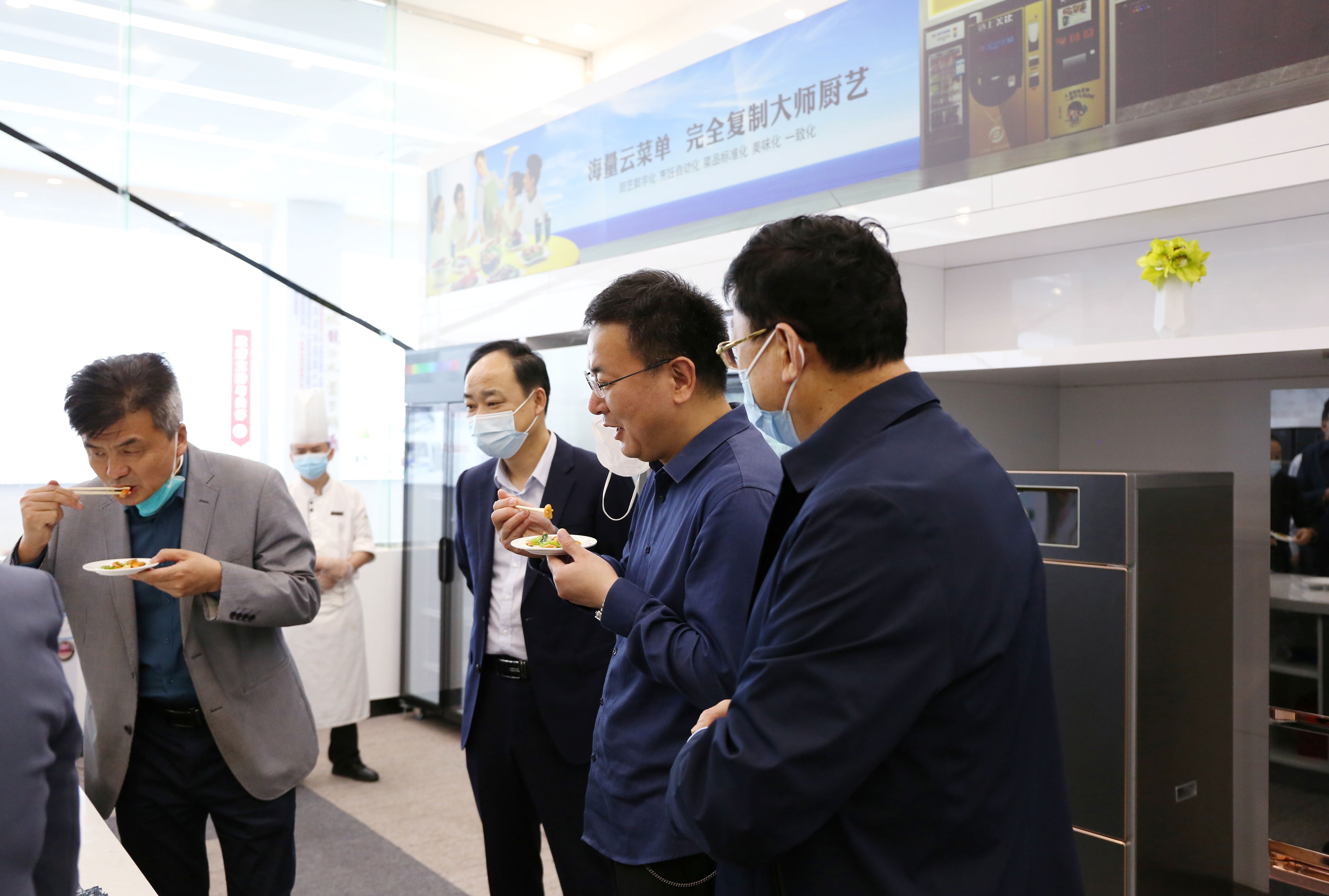 接著,黃院長一行又來到公司的產品展示廳和轉型展示廳。集團公司董事長助理倪曙東向黃院長一行重點介紹了索伊集團的發展歷程。他聽后對索伊創新發展的路徑大為贊賞,對精準總結智能制造餐飲行業發展“八化”趨勢給予充分肯定。在中央廚房的體驗廳,現場觀看了無油煙、無明火、無污染、快捷環保的廚神和野牛機器人分別炒制的蔥爆河蝦和黑椒牛肉粒炒制過程。當黃院長一行品嘗菜品后更是贊不絕口,他深有感觸地說:“色香味俱全,口感很好,肉嫩細滑、咸淡精確適宜,很好吃。”這臺野牛炒菜機器人,值得在學校食堂推廣使用,我希望以后我們有合作的機會。”