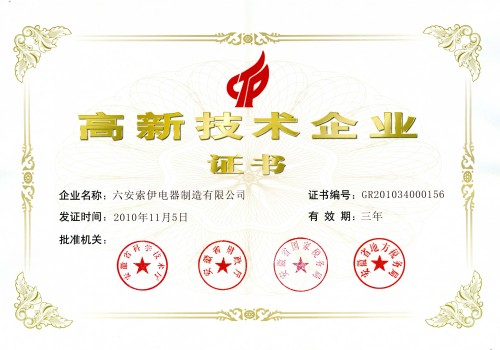 ——熱烈祝賀六安索伊電器榮獲“安徽省2010年高新技術(shù)企業(yè)”榮譽(yù)稱(chēng)號(hào)