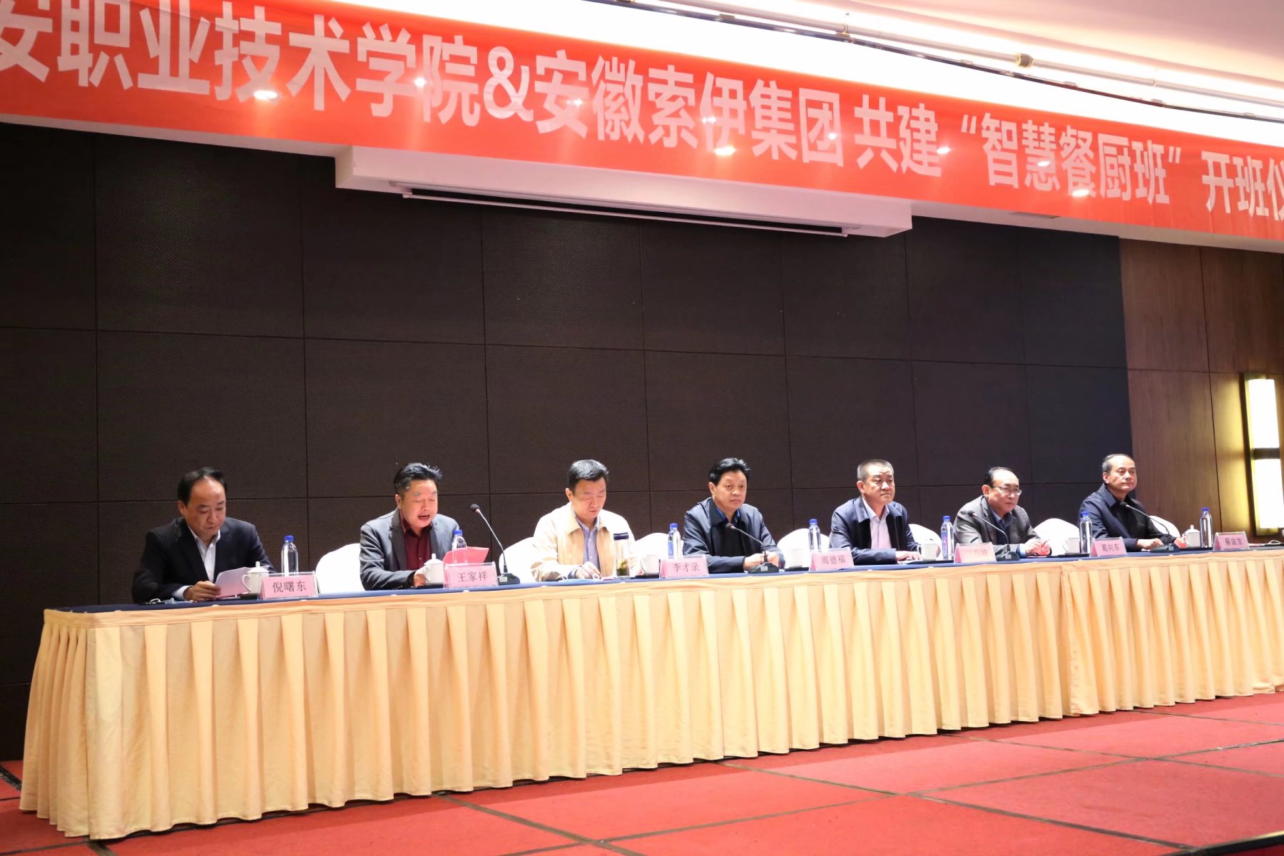 2021年11月5日下午四點(diǎn),六安職業(yè)技術(shù)學(xué)院與安徽索伊集團(tuán)共建“智慧餐廚”班開班儀式在六安索伊君瀾大酒店隆重舉行,六安職業(yè)技術(shù)學(xué)院黨委書記周德福,黨委副書記、院長葛向東,黨委委員、副院長王家祥,安徽索伊集團(tuán)董事長王瓊峰,董事長助理倪曙東,黨委書記汪顯華參加了開班儀式,市經(jīng)信局黨組成員、副局長李才錄、市人力資源保障局四級調(diào)研員蔡宜生應(yīng)邀到會,以及智慧餐廚班的51位學(xué)生及老師共同參加了開班儀式。