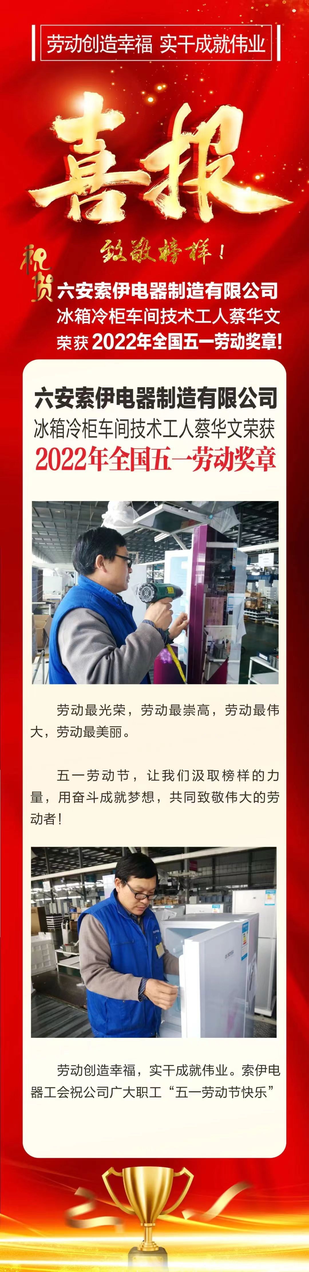 喜報:六安索伊電器制造有限公司冰箱冷柜車間技術工人蔡華文榮獲2022年全國五一勞動獎章!